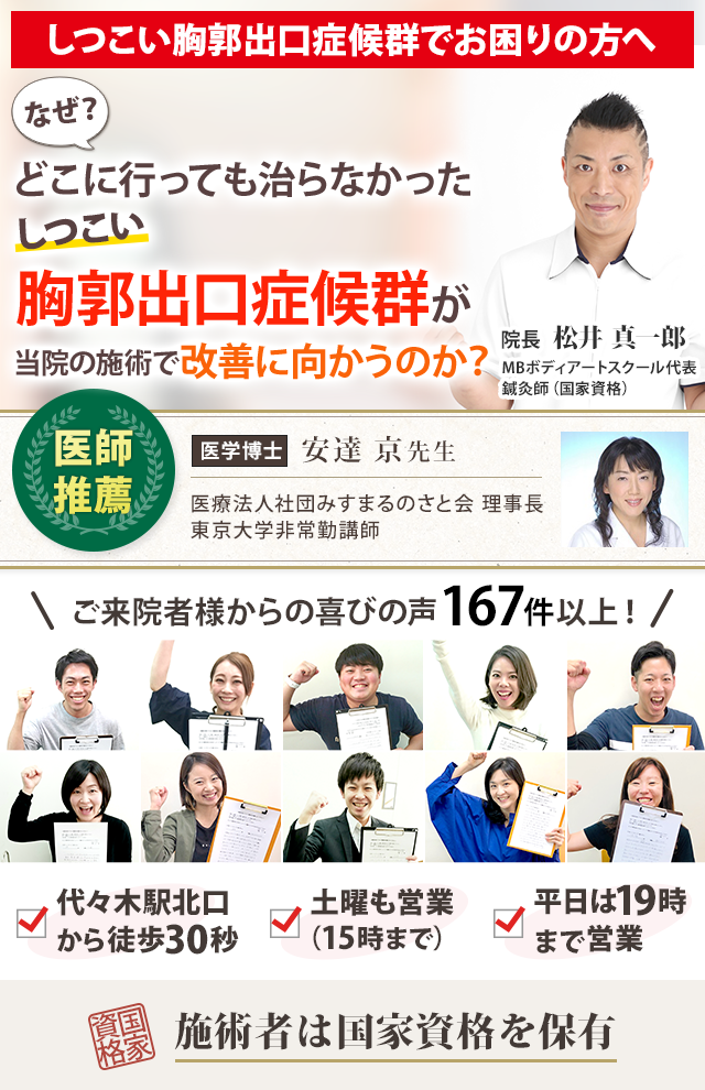 軽い症状の場合、整形外科や一般的な整骨院などで胸郭出口症候群が改善される場合もありますが、実際には、